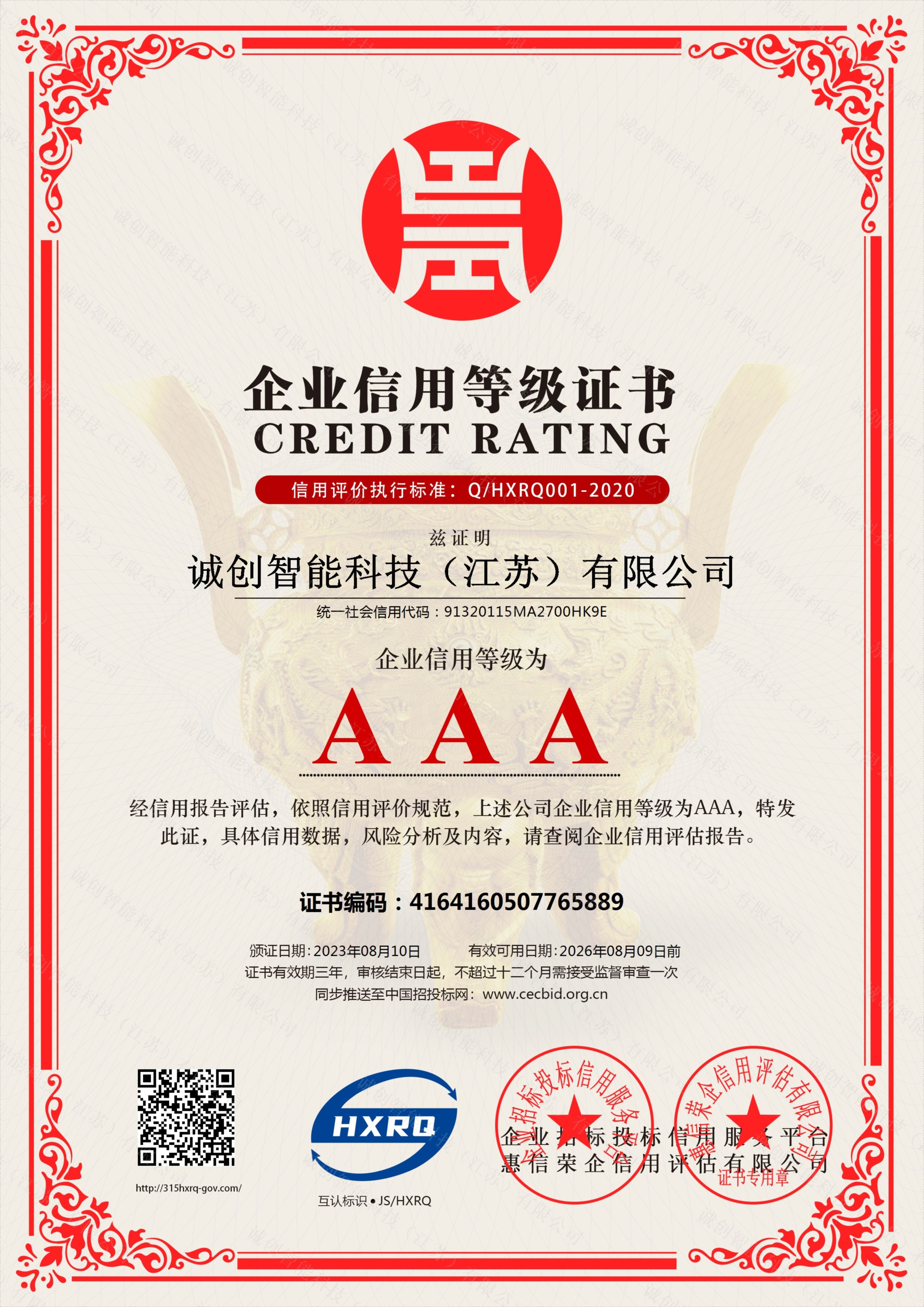 企業(yè)信用等級(jí)3A證書