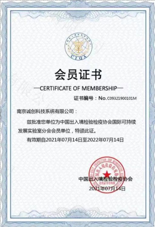中國出入境檢驗(yàn)檢疫協(xié)會(huì)可持續(xù)發(fā)展實(shí)驗(yàn)室分會(huì)會(huì)員證書